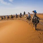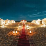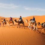 After breakfast, explore the stunning rock formations of Dades Valley, including the “Monkey Fingers.” Head to Tinghir and visit the Todra Gorges, known for their dramatic cliffs and refreshing river. Continue the journey through scenic desert landscapes, arriving at Merzouga in the late afternoon. Embark on a camel trek into the Erg Chebbi dunes, enjoying a beautiful sunset before arriving at your camp. Experience traditional Moroccan hospitality with a delicious dinner, live music, and storytelling under the stars.