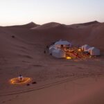 After breakfast, drive through the spectacular Todra Gorges for a short walk and some photo opportunities. Then continue toward the golden dunes of Merzouga, with a stop to shop for traditional scarves or enjoy a quick henna tattoo if desired. In the afternoon, meet your camel guide and ride across the dunes, arriving at your desert camp in time for sunset. Enjoy sandboarding and sunset photos, followed by a delicious dinner and live Berber music around the campfire. Your luxury tent includes a private shower and toilet.